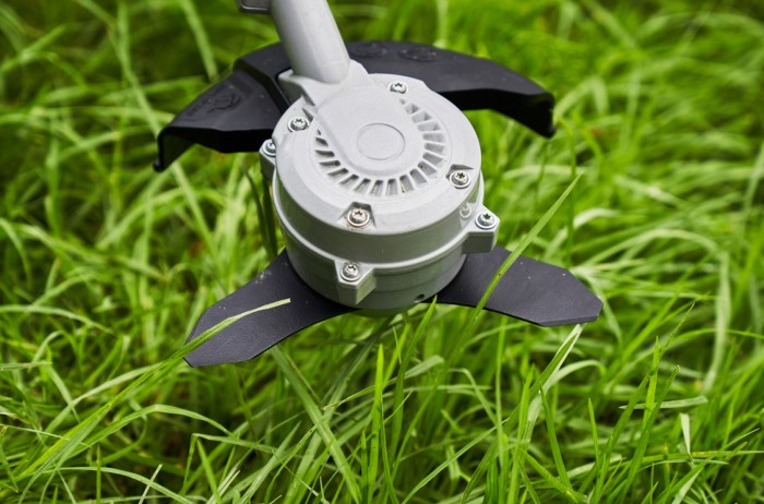 Trim with the bump feed nylon head or swap out the 3 tooth metal blade for clearing large areas and brush cutting.