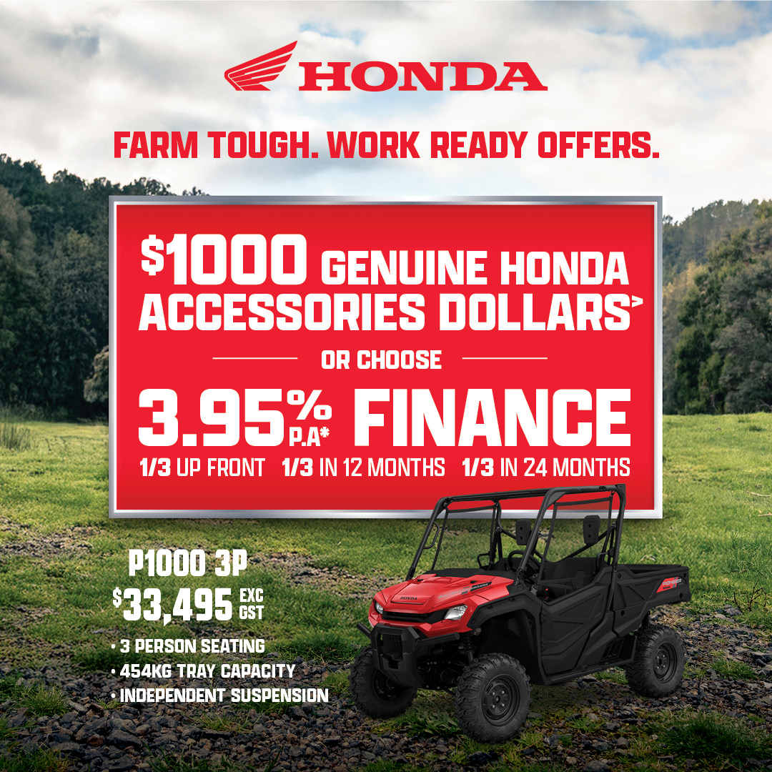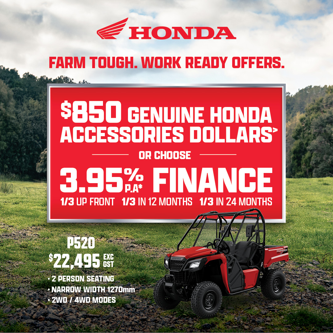 This Honda Rider Finance offer is based on a 3.95% p.a. interest rate fixed for the 24-month term of the loan. This offer applies to eligible new Honda motorbike models only (XR190, XR150, XRM125, CT125F, TRX250TM1, TRX420TM1, TRX420FM1, TRX420FM2, TRX420FA2, TRX420FA6, TRX520FM1, TRX520FM2, TRX520FM6, TRX520FA6, TRX520FA7, TRX700FA5, Pioneer 520, Pioneer 700-2P, Pioneer 700-4P, Pioneer 1000-3P, Pioneer 1000-5P and Pioneer 1000-6P), financed on or before 27 March 2026 (or while stocks last). An up-front deposit of one-third (1/3) of the RRP is required plus the cost of any accessories fitted, and the fees detailed below. Two further payments of 1/3 of the RRP are to be paid on the one-year loan anniversary and the two-year loan anniversary. A $130 UDC establishment fee, $10.35 PPSR fee, monthly maintenance fee of $2 and dealer origination fee applies (your Honda motorbike dealer can tell you their applicable fee). This offer is available at participating Honda motorbike dealerships only and is not available in conjunction with any other finance offer, promotion, or discount. Honda Rider Finance is provided by UDC Finance Limited. Any loan is subject to responsible lending inquiries. UDC’s loan eligibility criteria, fees, terms and conditions apply.